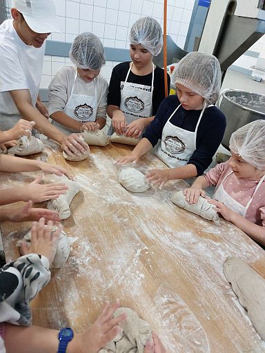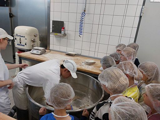 „Am Anfang waren einige Eltern so nett, dass sie Fahrgemeinschaften gründeten und uns zur Bäckerei Meyer fuhren. Wir haben uns an der Schule getroffen und sind von dort dann in die Bäckerei gefahren. Vor der Bäckerei haben wir uns getroffen und einige Dinge besprochen. Dann haben alle Kinder eine Schürze und ein lustiges Haarnetz bekommen. Anschließend hat uns Marie in die Bäckerei geführt. Dort war eine große Schüssel mit Hefe, Salz, Sauerteig, Roggenmehl und Weizenmehl. Dann wurde alles mit Wasser verrührt. Danach haben wir den Teig geknetet und zu einem Brot geformt. Anschließend haben wir es in das Gärkörbchen gelegt. Danach haben wir gefrühstückt. Nun wurden die Brote aus dem Gärkörbchen genommen. Dann hat Herr Franz uns durch die Bäckerei geführt. In der Zeit wurde unser Brot gebacken. Es hat allen super viel Spaß gemacht. Am Ende wurde das Brot verteilt und wir durften die Schürzen und das Haarnetz mitnehmen. Das Brot ist super lecker. Der Tag war super toll!“ (Carl, Klasse 3b)