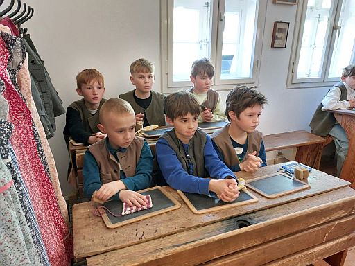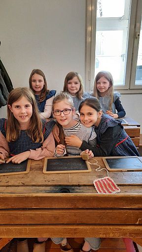 Sehr beeindruckend war auch die nachgestellte Unterrichtsstunde in einem alten Klassenzimmer. Die Kinder schlüpften dabei in die Rollen von Schülerinnen und Schülern aus vergangenen Zeiten.
